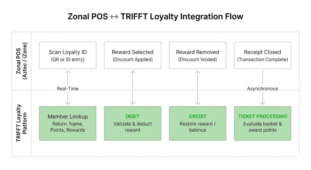 TRIFFT integrates with Zonal EPOS (Aztec / iZone) by replacing Zonal's internal loyalty engine using the iZone Loyalty Plugin model.